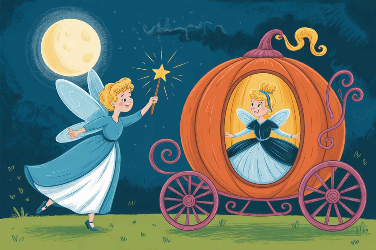 Suatu hari kerajaan mengadakan pesta. Semua gadis diundang termasuk Cinderella. Namun ibu tirinya melarangnya pergi. Setelah keluarga tiri berangkat, Cinderella duduk menangis. Tiba tiba peri baik hati muncul dan berkata, Jangan sedih. Aku akan membantumu. Peri itu mengubah labu menjadi kereta dan memberi gaun indah untuk Cinderella.