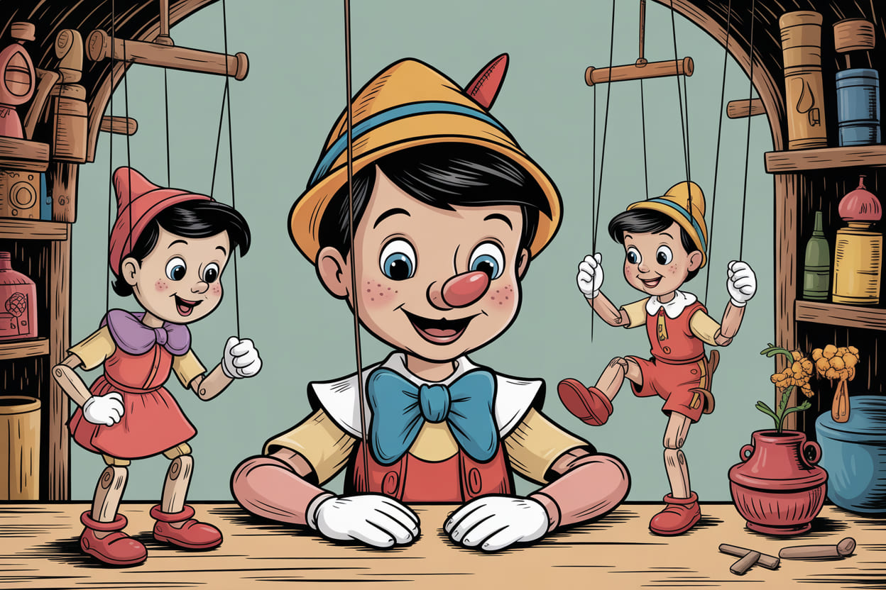 Pinokio sering tergoda mengikuti teman teman nakal yang mengajaknya bermain saat ia seharusnya belajar. Ia juga beberapa kali berkata bohong agar terhindar dari masalah.