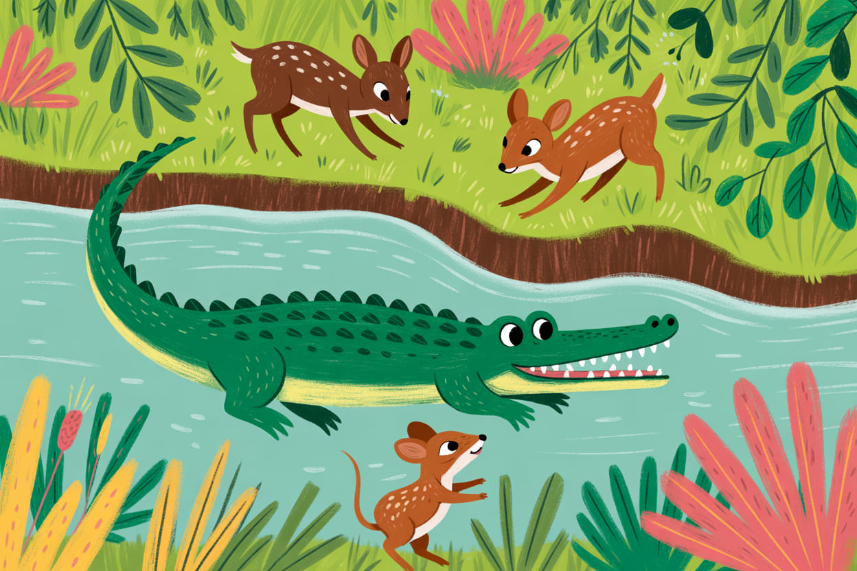 Kancil adalah hewan kecil yang cerdik. Suatu hari ia ingin menyeberangi sungai, tetapi sungai itu penuh buaya yang lapar. Kancil takut dimakan jika ia berenang. Ia lalu duduk di tepi sungai dan memikirkan rencana. Tiba tiba ia mendapatkan ide cerdik.