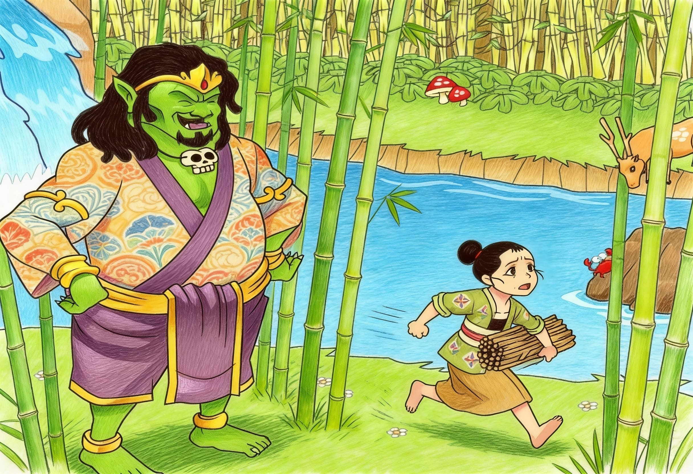 Ketika raksasa mengejar Timun Emas, ia melempar biji mentimun. Biji itu berubah menjadi hutan bambu rimbun. Raksasa terluka ketika mencoba melewatinya. Timun Emas kemudian melempar jarum yang berubah menjadi duri panjang.