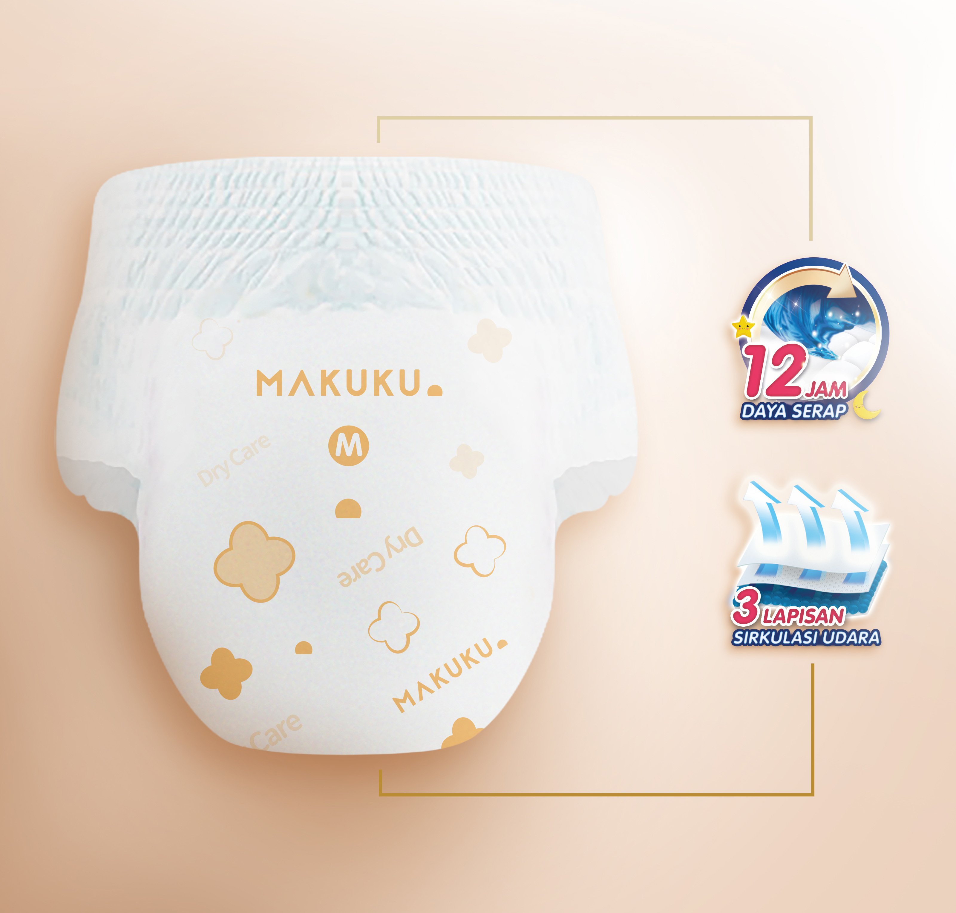 MAKUKU Dry Care dirancang untuk perlindungan setiap hari dengan penyerapan maksimal selama 12 jam. Popok tetap kering, bebas lembab dan gerah. Cocok untuk penggunaan setiap hari.