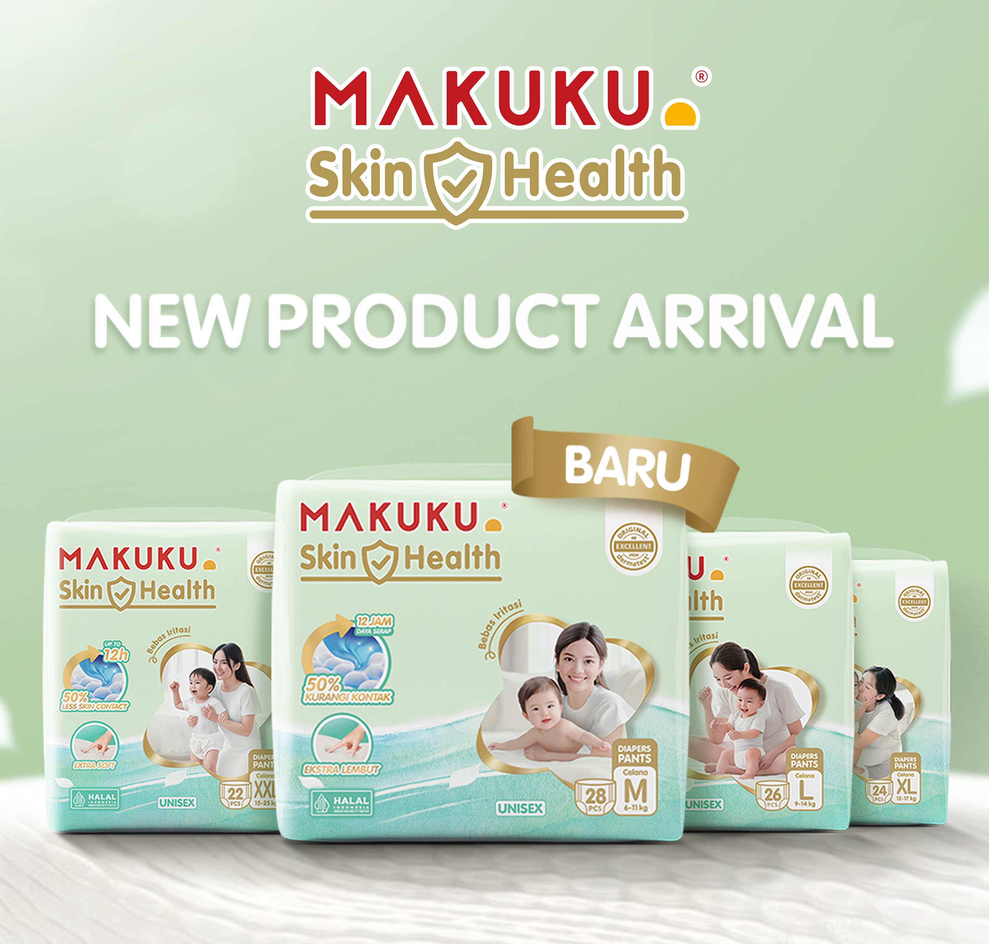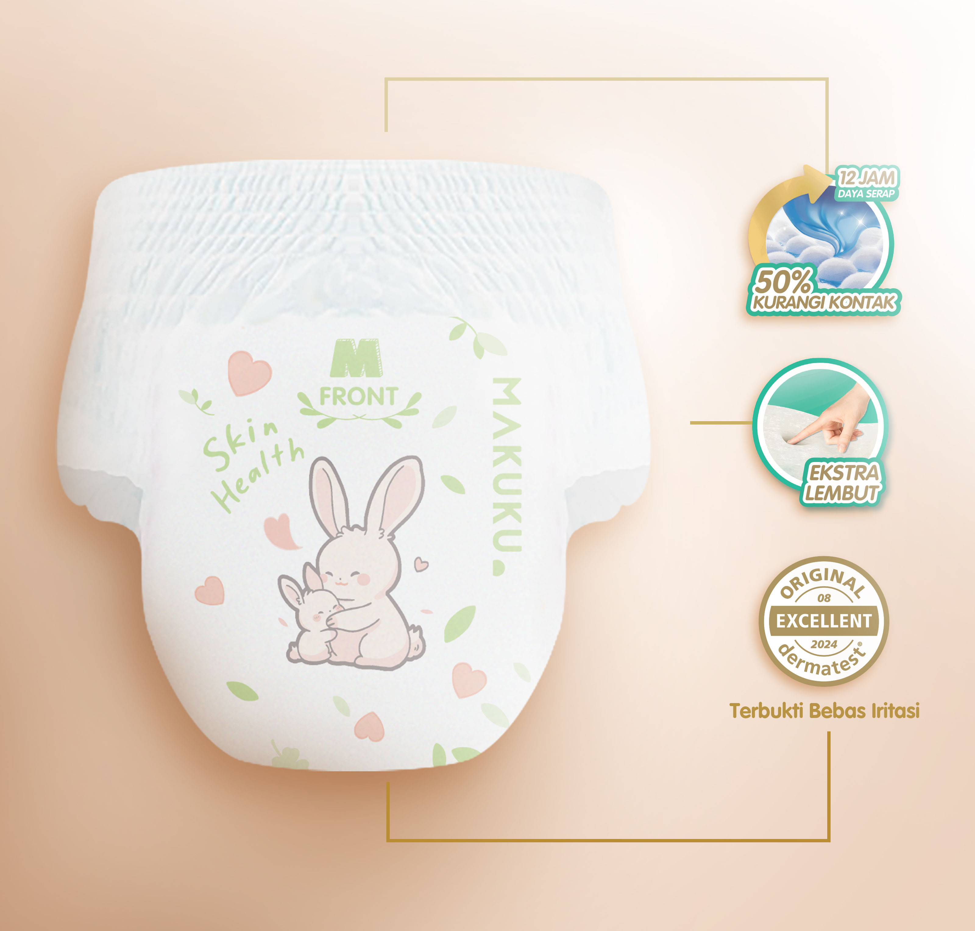 Makuku Skin Health adalah popok celana yang dirancang khusus untuk menyerap kelembapan dan mengurangi rasa tidak nyaman karena basah pada kulit bayi. Dengan bantalan timbul adaptif, mengurangi kontak dengan kulit hingga 50%. Cocok untuk menemani si Kecil hingga 12 jam. Terbukti bebas iritasi telah melalui uji dermatologis secara ketat di Jerman oleh Dermatest GmbH, sebuah lembaga independen berstandar internasional.